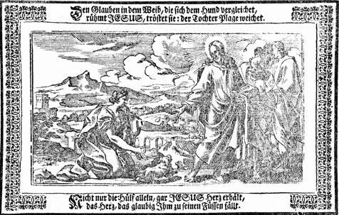 Description: A Canaanite woman asks Jesus to heal her daughter. A dog is at her feet representing the substance of their conversation. The artist’s or engraver’s initials (EP) have been placed at the bottom left corner.