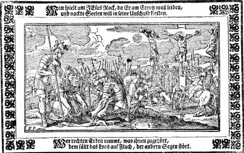 Description: Jesus hangs on the cross between two thieves as the soldiers cast lots for his clothing. The artist’s or engraver’s initials (EP) have been placed at the bottom left corner.