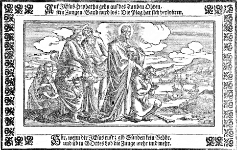 Description: Jesus cures a deaf man with a speech impediment by first putting his fingers in the man's ears, then spitting and touching the man's tongue while looking up into heaven and saying, "Be opened”.