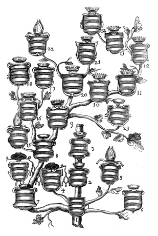 Description: A family tree of the House of Carafa with symbols above the coat of arms to designate the position of the individual. The coat of arms and engravings in this book were designed by Silvestro Pietrasanta (1590-1647) .