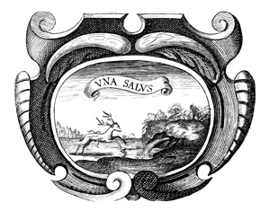 Description: An engraving depicting a stag with snakes on him running towards a pool of water. The coat of arms and engravings in this book were designed by Silvestro Pietrasanta (1590-1647) .