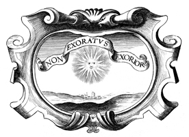 Description: An engraving depicting a sun rising over a city. The coat of arms and engravings in this book were designed by Silvestro Pietrasanta (1590-1647) .