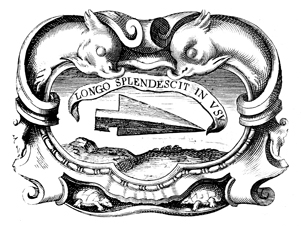 Description: An engraving of an arrow head beneath a Latin motto. The border surrounding the image consists of two fish overlooking the arrow head and two turtles at the bottom of the border. The coat of arms and engravings in this book were designed by Silvestro Pietrasanta (1590-1647) .