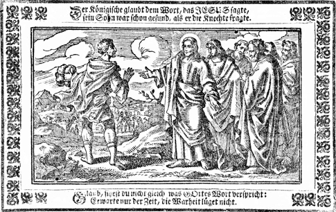 Description: Jesus tells the official that his son has been made well, while in the background the official is greeted by his slaves who confirm this news.