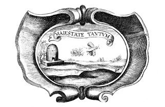 Description: This engraving depicts a bee leaving its hive with other bees behind it. The Latin motto above the image reads "Oh Joy!" The coat of arms and engravings in this book were designed by Silvestro Pietrasanta (1590-1647).