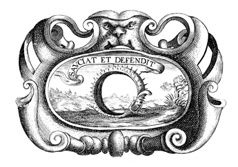 Description: An engraving that depicts a spiked belt on its side in a field. The Latin motto above the belt reads, "It wounds and defends" most likely referring to the belt in the image. The coat of arms and engravings in this book were designed by Silvestro Pietrasanta (1590-1647).