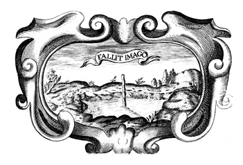 Description: An engraving that depicts a rod in a pond fed by a spring of water. The Latin phrase above the image roughly translates to, "Deceptive Image." The coat of arms and engravings in this book were designed by Silvestro Pietrasanta (1590-1647).