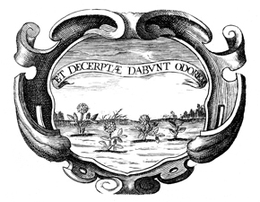 Description: An engraving depicting three flowers that budded, and a fourth plant that does not have a flower yet. The coat of arms and engravings in this book were designed by Silvestro Pietrasanta (1590-1647).