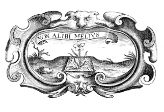 Description: An engraving depicting a flower amidst a field with dead plants. The Latin motto above the flower roughly translates to, "It is not better elsewhere." The coat of arms and engravings in this book were designed by Silvestro Pietrasanta (1590-1647).