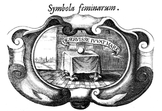 Description: An engraving depicting an orb on a table in what appears to be a home. The coat of arms and engravings in this book were designed by Silvestro Pietrasanta (1590-1647).