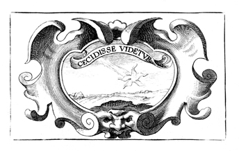 Description: An engraving depicting an estoile falling from the heavens. The Latin motto above the estoile roughly translates to, "It seems to have fallen." The coat of arms and engravings in this book were designed by Silvestro Pietrasanta (1590-1647).
