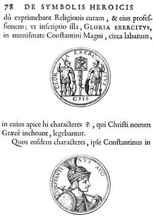 Description: This engraving depicts a Roman coin from the time of Constantine the Great. The front of the coin, which is on the bottom of the page, depicts Constantine while the back of the coin depicts Constantine's army. The coat of arms and engravings in this book were designed by Silvestro Pietrasanta (1590-1647).