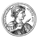 Description: This is a copper plate engraving of a Roman coin. The image on the coin depicts an emperor ready for battle, as he has a shield, a helmet, and a spear. The coat of arms and engravings in this book were designed by Silvestro Pietrasanta (1590-1647) .