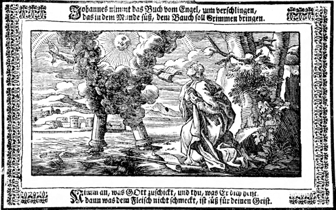 Description: An angel instructs John to eat the little scroll.