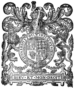 Description: The coat of arms of Charles I, king of England, Scotland, and Ireland (r. 1625–1649). A crowned lion, symbol of England, and a unicorn, symbol of Scotland, support the shield. The three lions of England appear in the shield’s first and third quadrant, the lion of Scotland in the second, and the harp of Ireland in the fourth. The motto HONI SOIT QVI MAL Y PENSE (“Evil to him who thinks evil”) emblazons the shield-encircling garter, and across the bottom runs DIEV ET MON DROIT (“God and my right”).