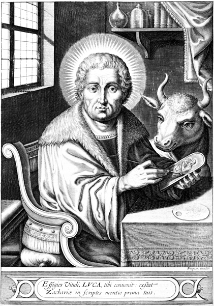 Description: Luke writes the gospel with his attribute, the ox, nearby. The name of the engraver, Jacques Picquet (1600-1650), has been placed at the bottom right.