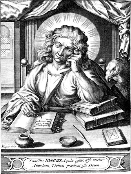 Description: John writes the gospel with his attribute, the eagle, nearby. The name of the engraver, Jacques Picquet (1600-1650) has been placed at the bottom right.