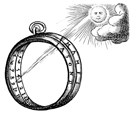 Description: A copper plate engraving of a sundial ring angled towards the sun in order to read the time. Note the numbers on the inside and the outside of the ring band, which differs from other sundial rings that open at the top. The coat of arms and engravings in this book were designed by Silvestro Pietrasanta (1590-1647).