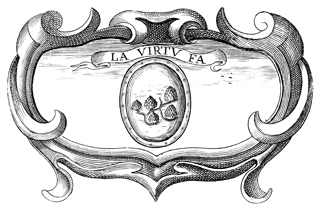 Description: This engraving depicts a collection of five hop flowers in the center of the engraving. Above the engraving is a Latin motto regarding virtue. The coat of arms and engravings in this book were designed by Silvestro Pietrasanta (1590-1647).