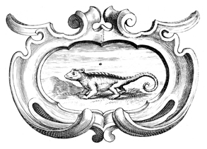 Description: An engraving depicting an iguana without a mane. The coat of arms and engravings in this book were designed by Silvestro Pietrasanta (1590-1647).