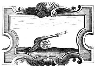 Description: This engraving is a depiction of a cannon shortly after firing a cannon ball. The border around the image is adorned with a seashell at the top. The coat of arms and engravings in this book were designed by Silvestro Pietrasanta (1590-1647).