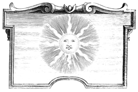 Description: This engraving is an image of a sun. The border of the engraving is quite simplistic with small details around the image. The coat of arms and engravings in this book were designed by Silvestro Pietrasanta (1590-1647).
