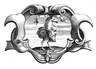 Description: This engraving depicts a creature with the head of a horse, the face of a man, and the body of an ostrich. The coat of arms and engravings in this book were designed by Silvestro Pietrasanta (1590-1647).