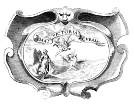 Description: This engraving depicts a scene from the life of Perseus, a character in Greek mythology. The Latin motto above Perseus reads, "Victory loves diligence." The coat of arms and engravings in this book were designed by Silvestro Pietrasanta (1590-1647).