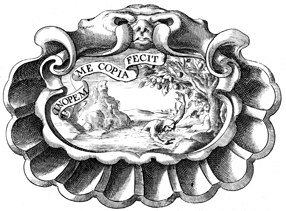 Description: This engraving depicts Tantalus in a pool of water attempting to reach out and grab fruit, but not able to do so. The Latin motto above the engraving reads, "Abundance makes me poor." The coat of arms and engravings in this book were designed by Silvestro Pietrasanta (1590-1647).