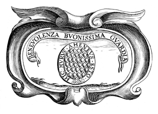 Description: This copper plate engraving depicts a coat of arms with the shield covered in hearts. The owner of this coat of arms is unknown. The coat of arms and engravings in this book were designed by Silvestro Pietrasanta (1590-1647).