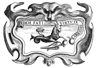 Description: A copper plate engraving that depicts a seahorse with a cornucopia on his back and a holding spear with a sphere attached. The Latin motto above the seahorse reads, "Faith will follow the power of fate." The coat of arms and engravings in this book were designed by Silvestro Pietrasanta (1590-1647).
