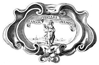Description: This copper plate engraving is a rendition of the coat of arms of Eleanor of Toledo, Duchess of Florence (1522-1562). The woman in the center of the image is holding a dagger. The coat of arms and engravings in this book were designed by Silvestro Pietrasanta (1590-1647).