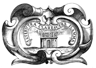 Description: This copper plate engraving depicts a building on fire with the Latin motto, "The flame grows brighter." The coat of arms and engravings in this book were designed by Silvestro Pietrasanta (1590-1647).