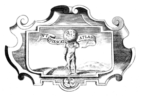 Description: This copper plate engraving depicts a man carrying the world on his shoulders and on top of his head. The coat of arms and engravings in this book were designed by Silvestro Pietrasanta (1590-1647).