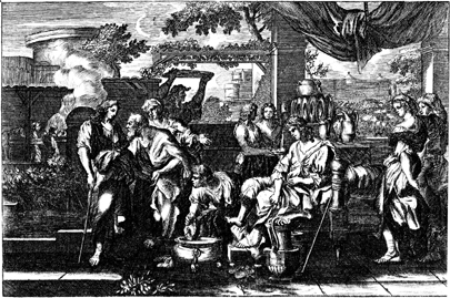 Description: Lot hosts two angels visiting Sodom, as they urge him and his family to leave Sodom before God destroys it.