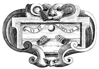 Description: This copper plate engraving depicts two items laying on a table with a sphere above them. The Latin motto at the top of the image reads, "Force and by virtue of." The coat of arms and engravings in this book were designed by Silvestro Pietrasanta (1590-1647).