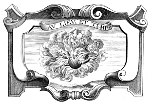 Description: This copper plate engraving depicts a grenade set off in midair. The Latin motto above the orb and smoke reads, "In the place and time." The coat of arms and engravings in this book were designed by Silvestro Pietrasanta (1590-1647).