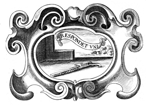 Description: A copper plate engraving that depicts a fallen staff with notches made on the side of the staff. The Latin motto above the staff reads, "One replies." The coat of arms and engravings in this book were designed by Silvestro Pietrasanta (1590-1647).