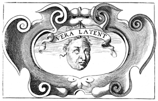 Description: This copper plate engraving depicts a mask of a human face without eyes. The Latin motto above the image roughly translates to, "The hidden truth." The coat of arms and engravings in this book were designed by Silvestro Pietrasanta (1590-1647).