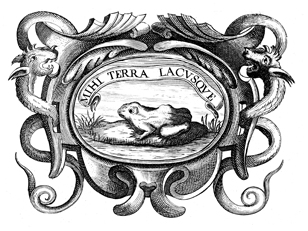 Description: This copper plate engraving is an image of a frog resting atop a rock. The border surrounding the image has two dragons on either side of the engraving. The coat of arms and engravings in this book were designed by Silvestro Pietrasanta (1590-1647).
