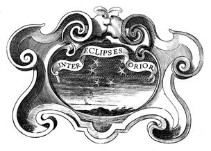 Description: A copper plate engraving depicting five-pointed stars rising in the night sky. The Latin motto above the scene roughly translates to, "Between eclipses rise." The coat of arms and engravings in this book were designed by Silvestro Pietrasanta (1590-1647).