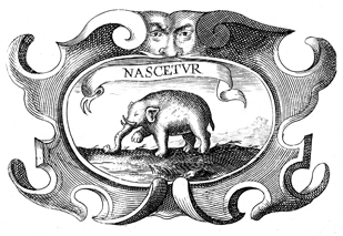 Description: A copper plate engraving that depicts a young elephant walking through a field. The coat of arms and engravings in this book were designed by Silvestro Pietrasanta (1590-1647).