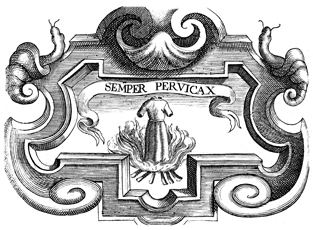 Description: A copper plate engraving with the image of an article of clothing in fire however, the fire does not consume the clothing. The coat of arms and engravings in this book were designed by Silvestro Pietrasanta (1590-1647).