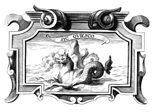 Description: A copper plate engraving with the image of a heraldic seahorse rising out of the ocean. The coat of arms and engravings in this book were designed by Silvestro Pietrasanta (1590-1647).