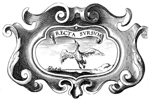 Description: A copper plate engraving that contains an image of a pelican taking flight near a body of water. The Latin motto above the pelican reads, "Straight up." The coat of arms and engravings in this book were designed by Silvestro Pietrasanta (1590-1647).