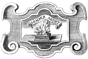 Description: A copper plate engraving that consists of a simplistic heraldic border surrounding an image of fire burning atop an ornate box. The Latin motto above the fire reads, "Always burns." The coat of arms and engravings in this book were designed by Silvestro Pietrasanta (1590-1647).