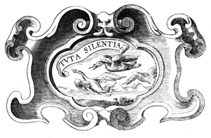 Description: This copper plate engraving consists of a simple heraldic border with the image of a traid of pelicans in the center. The Latin motto above the pelicans reads, "Safe and quiet." The coat of arms and engravings in this book were designed by Silvestro Pietrasanta (1590-1647).