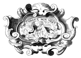 Description: A copper plate engraving with a heraldic border and an image of fire surrounding a sheet of paper or cloth. The coat of arms and engravings in this book were designed by Silvestro Pietrasanta (1590-1647).