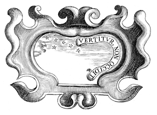 Description: This copper plate engraving depicts a sky full of stars. Next to the image is a Latin motto which roughly reads, "Concerned, therefore, does not kill." The coat of arms and engravings in this book were designed by Silvestro Pietrasanta (1590-1647).