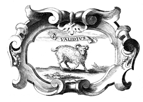 Description: A copper plate engraving that depicts a ram in a field. The coat of arms and engravings in this book were designed by Silvestro Pietrasanta (1590-1647).